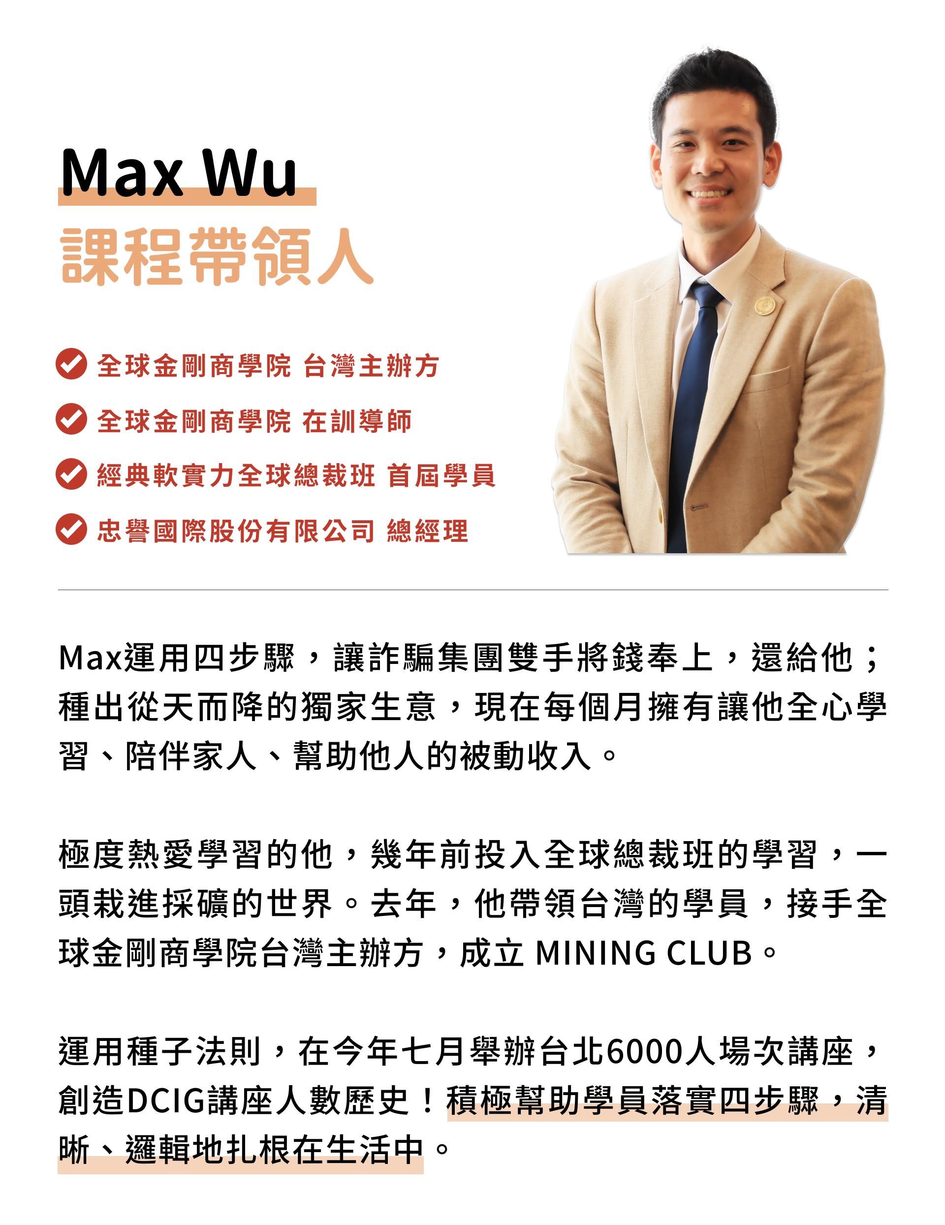 極度熱愛學習的他,幾年前投入全球總裁班的學習,一頭栽進採礦的世界。去年,他帶領台灣的學員,接手全球金剛商學院台灣主辦方,成立 MINING CLUB。運用種子法則,在今年七月舉辦台北6000人場次講座,創造DCIG講座人數歷史!積極幫助學員落實四步驟,清晰、邏輯地扎根在生活中。