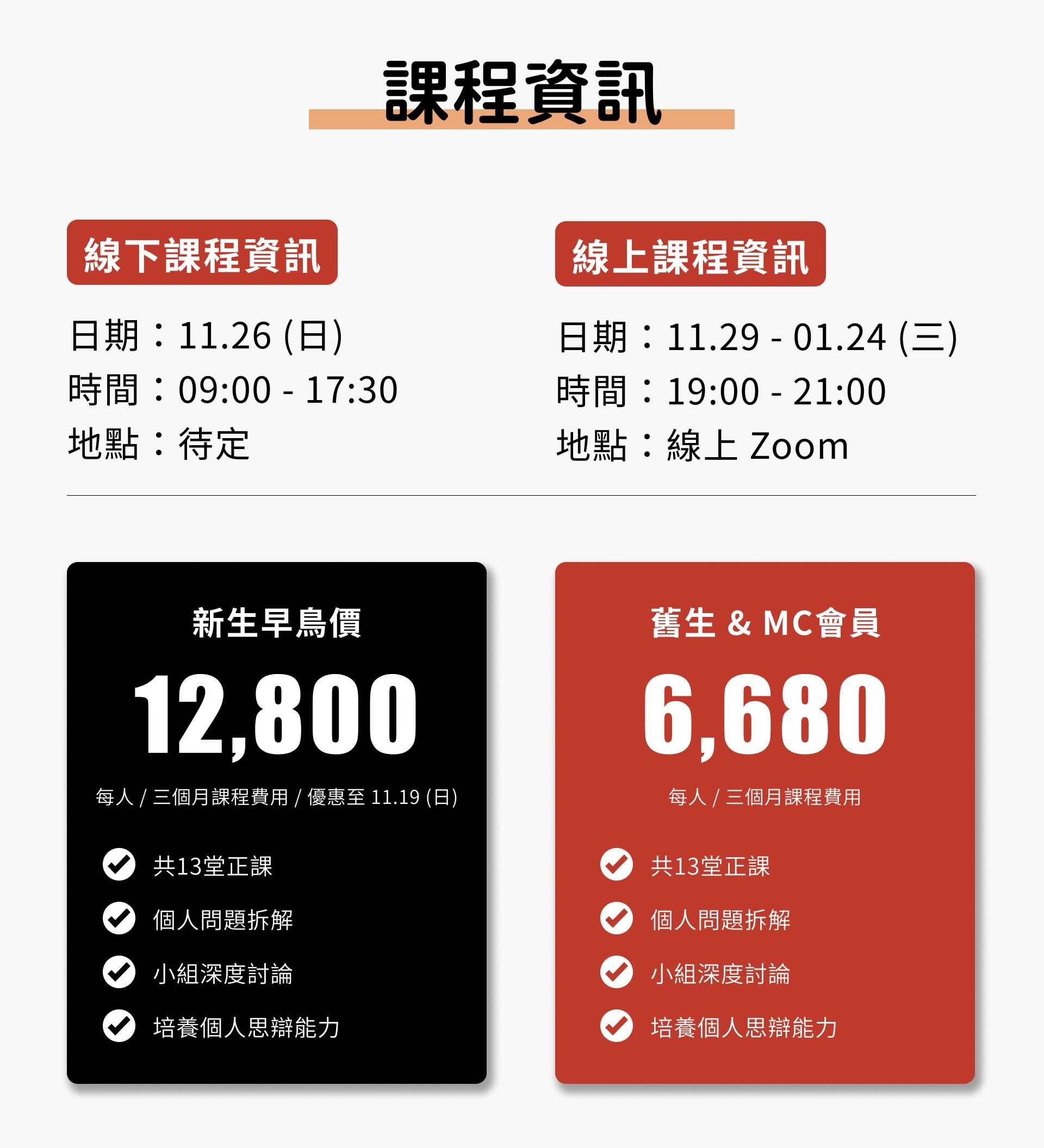 第一堂課會公告所有課程重要資訊,如第一堂課無法出席,邀請您報名下一季課程